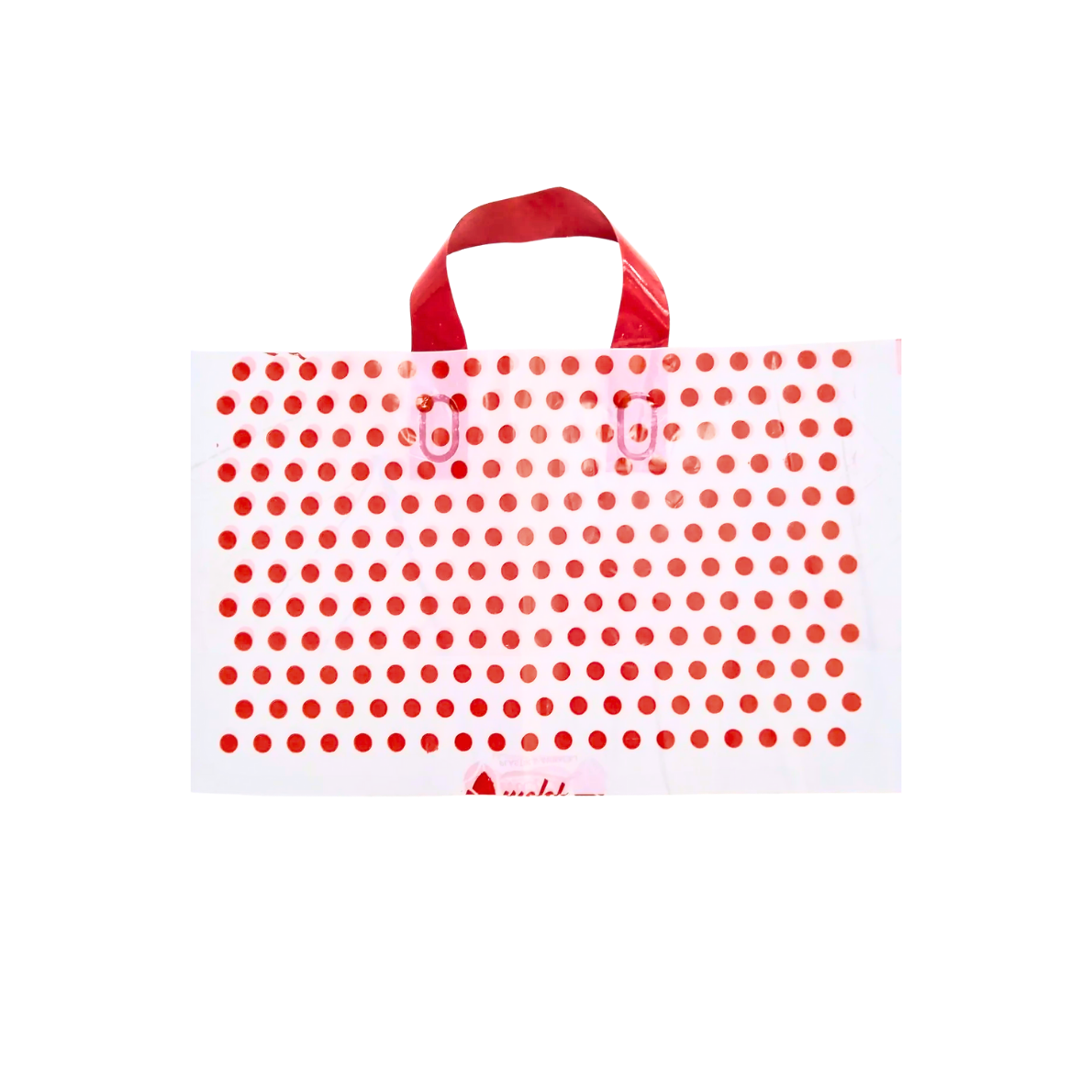 Kulplu Puantiyeli Çanta Mağaza Poşeti,Büyük boy ölçüsüyle günlük alışverişlerde ve mağaza kullanımlarında pratik ve şık bir çözümdür. Renkli puantiyeli deseni ile estetik bir görünüm sunarken, kulplu yapısı sayesinde kolay ve güvenli taşıma sağlar. 1 Kg’lık paket içeriğiyle ekonomik ve toplu kullanım için idealdir.